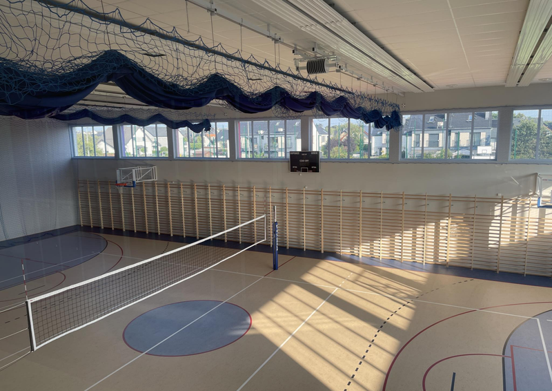 pełne wyposażenie sportowe: sala posiada stałe wyposażenie, w tym dwie bramki, kosze do koszykówki, siatkę do siatkówki/badmintona oraz drabinki gimnastyczne.